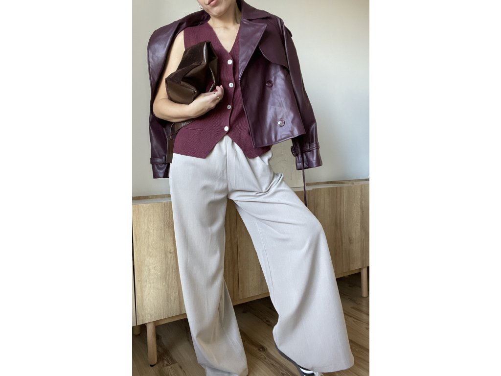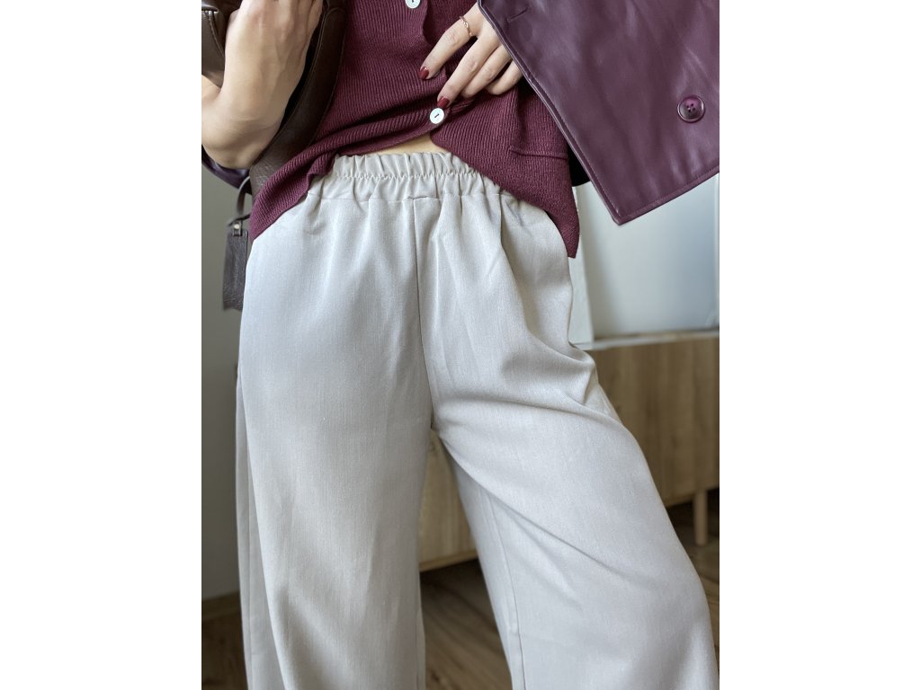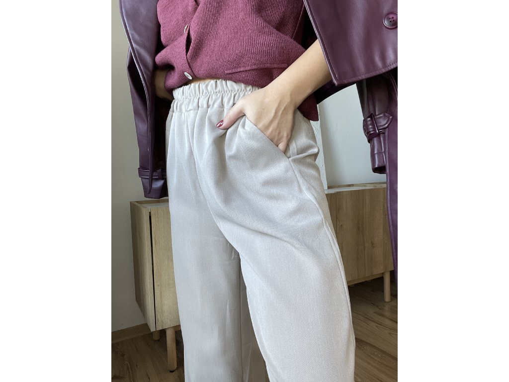 Nohavice jednoduchý,široký strih, v predu majú vrecka vzadu nie,na gumičku v páse, farba šédobéžová
