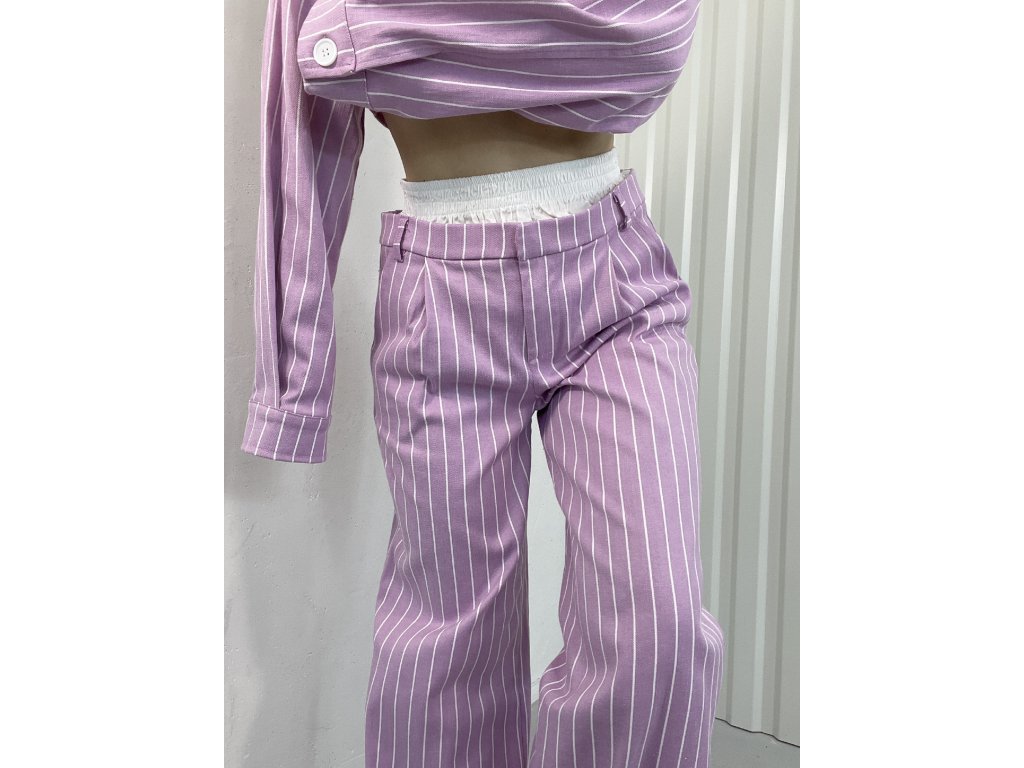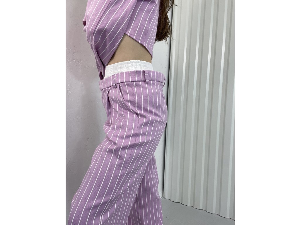 Široké nohavice ružovej farby,pruhovaná potlač,nohavice majú v páse gumu košeľového materiálu,čo im dodáva zaujímavy efekt