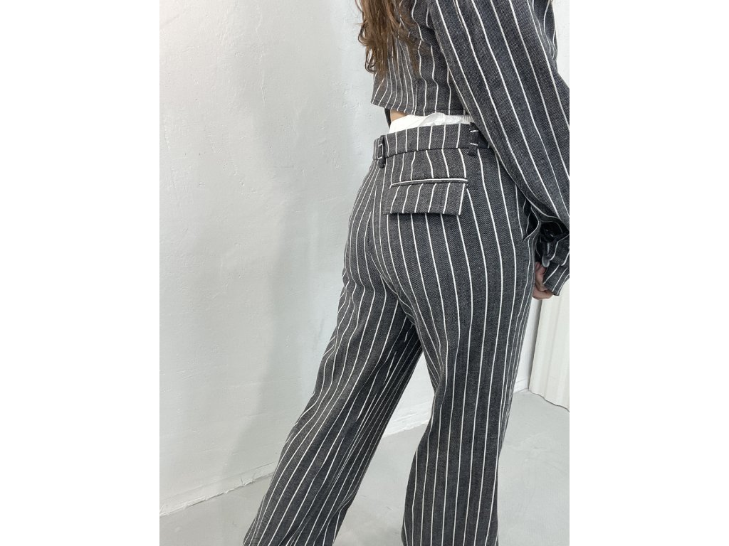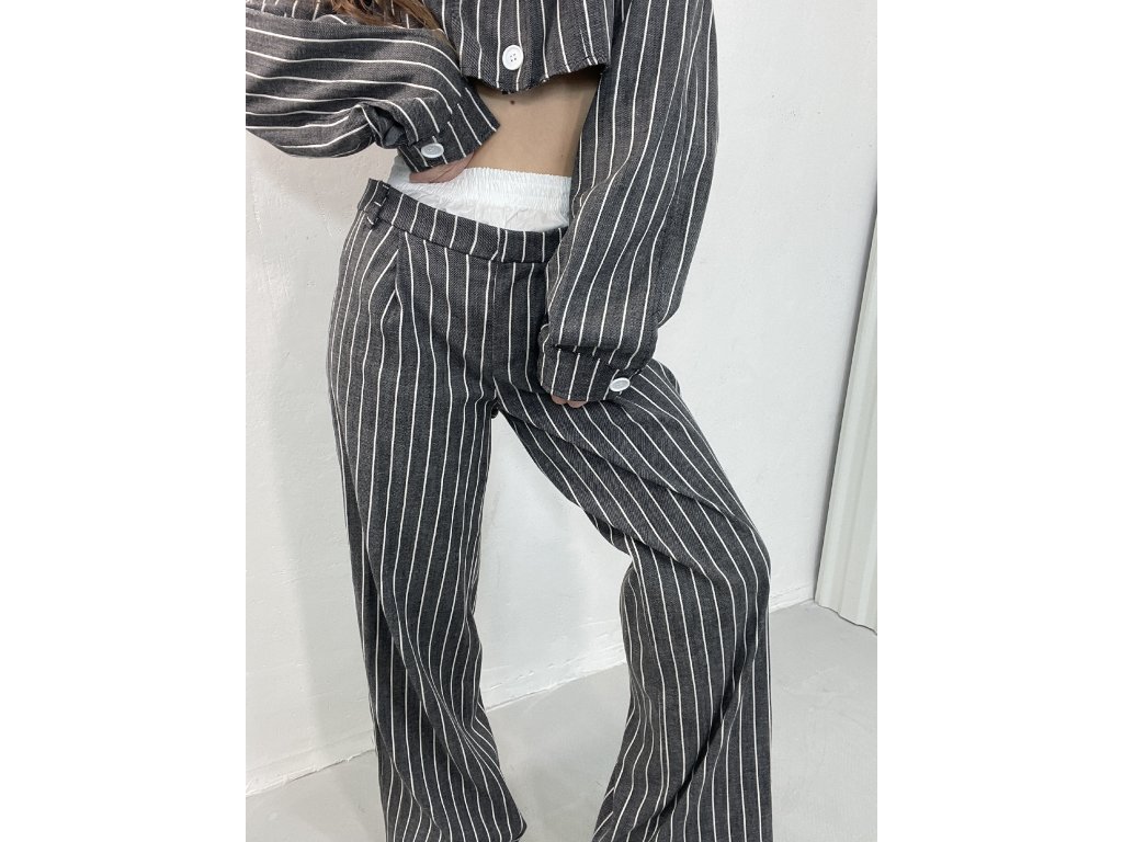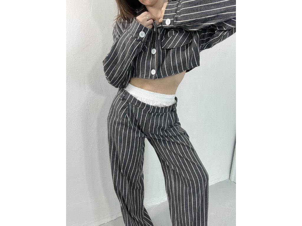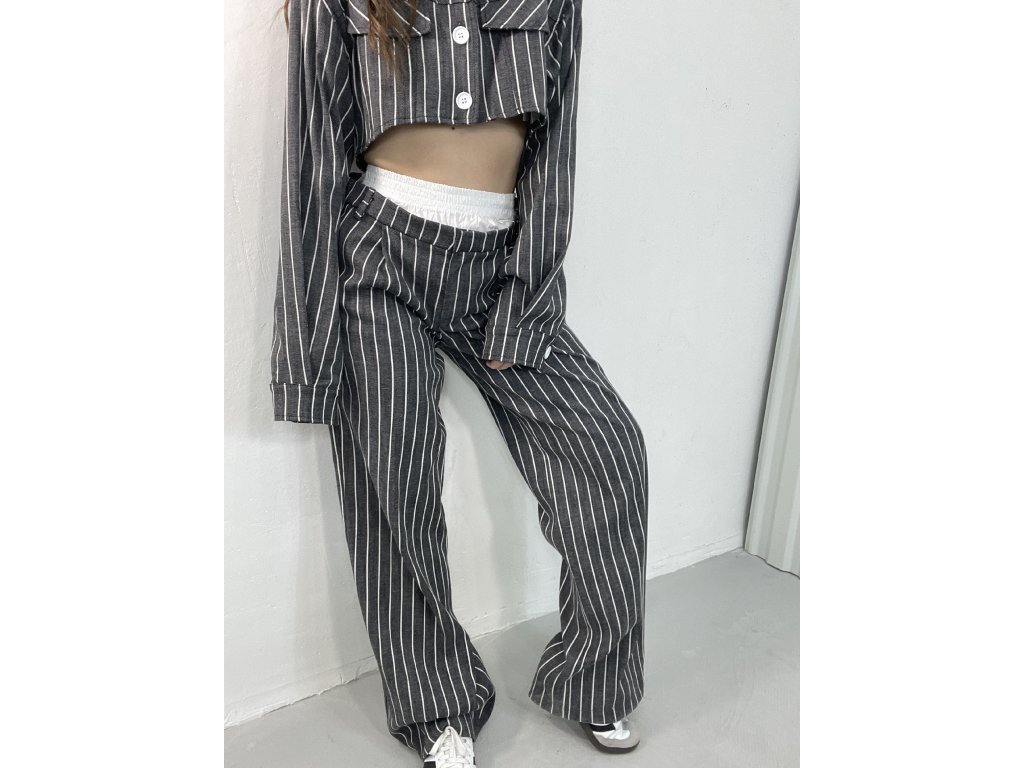 Široké nohavice tmavosivéj farby,pruhovaná potlač,nohavice majú v páse gumu košeľového materiálu,čo im dodáva zaujímavy efekt