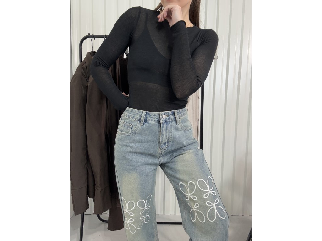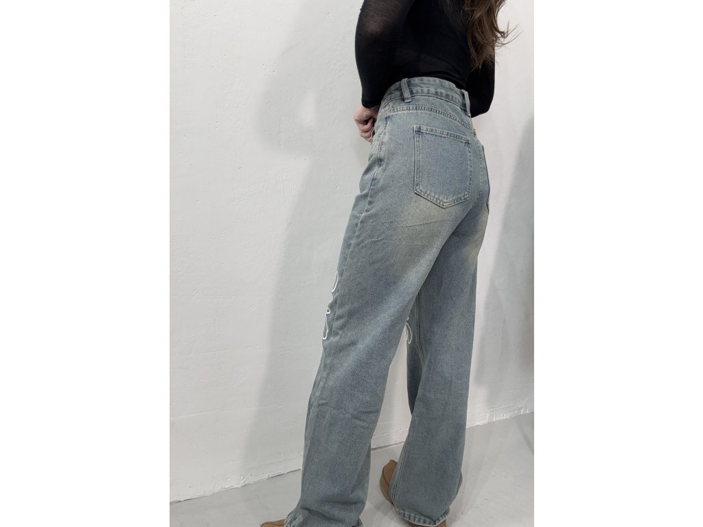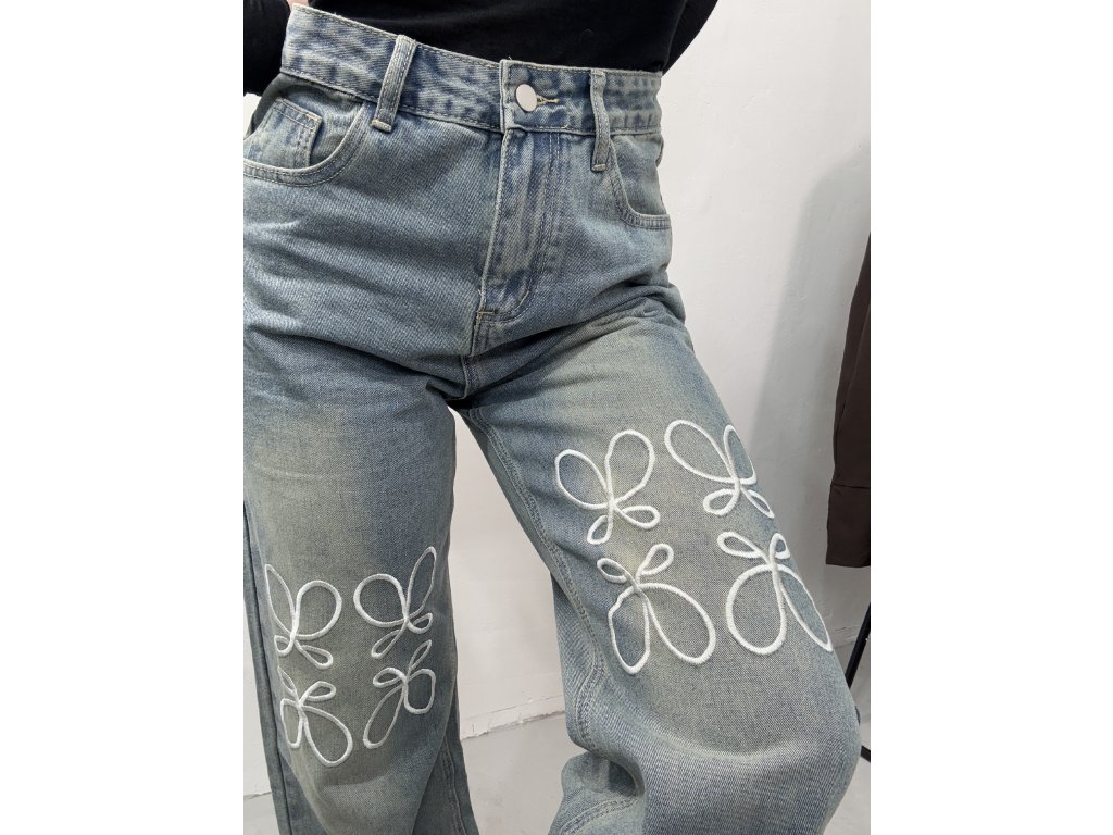 Trendy rifle s výraznou vyšivkou na kolenách.